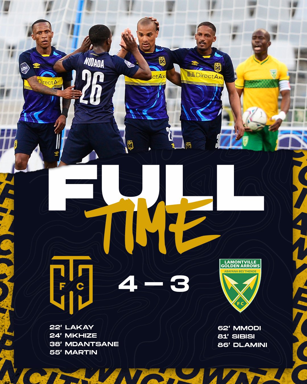 Cape Town City FC vs Lamontville Golden Arrows 1. Cape Town - Home side Cape Town City held out for a slender 4-3 DStv Premiership win over Lamontville Golden Arrows in a seven-goal thriller for their first home of the season at the Cape Town. In 1 3333 matches played at home was total goals team and opponent Over 15 goals.