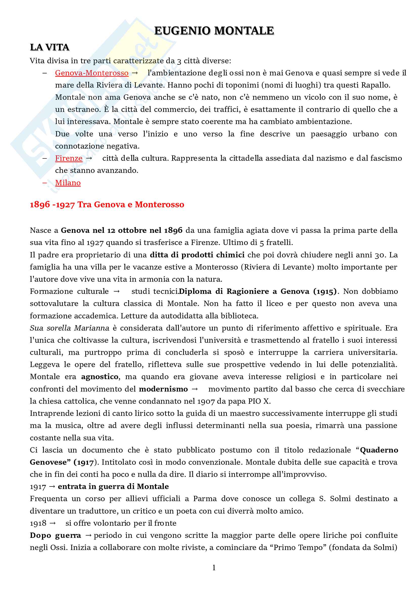 Riassunto della vita opere e pensiero di Eugenio Montale 2 pagine formato doc EUGENIO MONTALE. VITA E OPERE RIASSUNTO Eugenio Montale nasce a Genova il 12 ottobre 1896. In essa Montale rievoca le occasioni della sua vita passata amori incontri riflessioni ricordate non per nostalgia ma per analizzarle e capirle nel loro valore simbolico come ulteriori esemplificazioni del male di vivere.